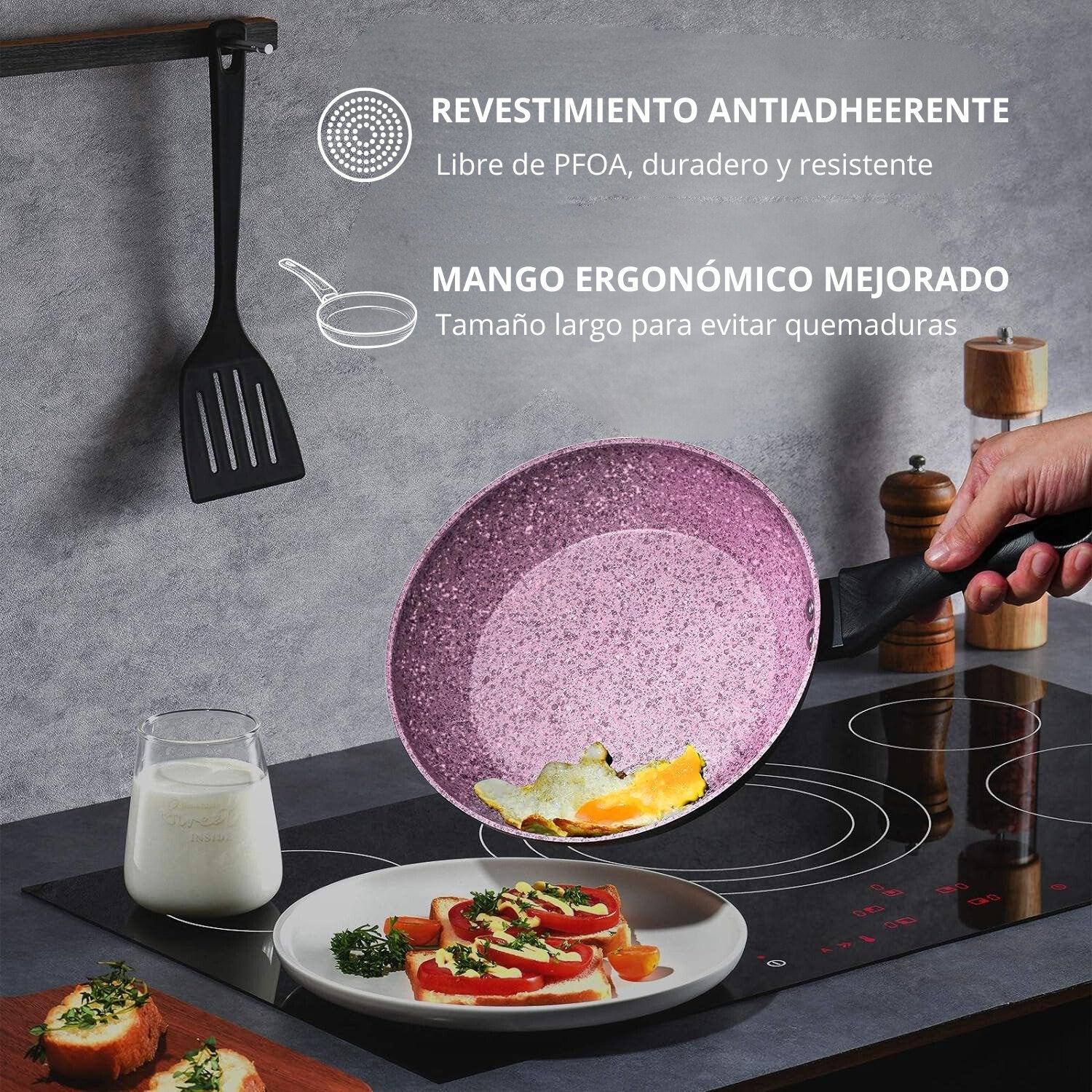 Ya sea cocina de gas, eléctrica, vitrocerámica o inducción, esta sartén de granito es versátil y se adapta a cualquier tipo de cocina.